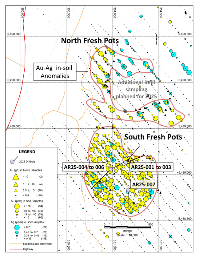 Drilling has tested three separate “hot-spot” clusters of strongly anomalous Au-Ag-As values within the larger South Fresh Pots soil anomaly (see figure below). Geophysical features identified in a DCIP geophysical survey conducted earlier this year have greatly enhanced targeting at both the South and North Fresh Pot areas. Assays are anticipated in the coming weeks.