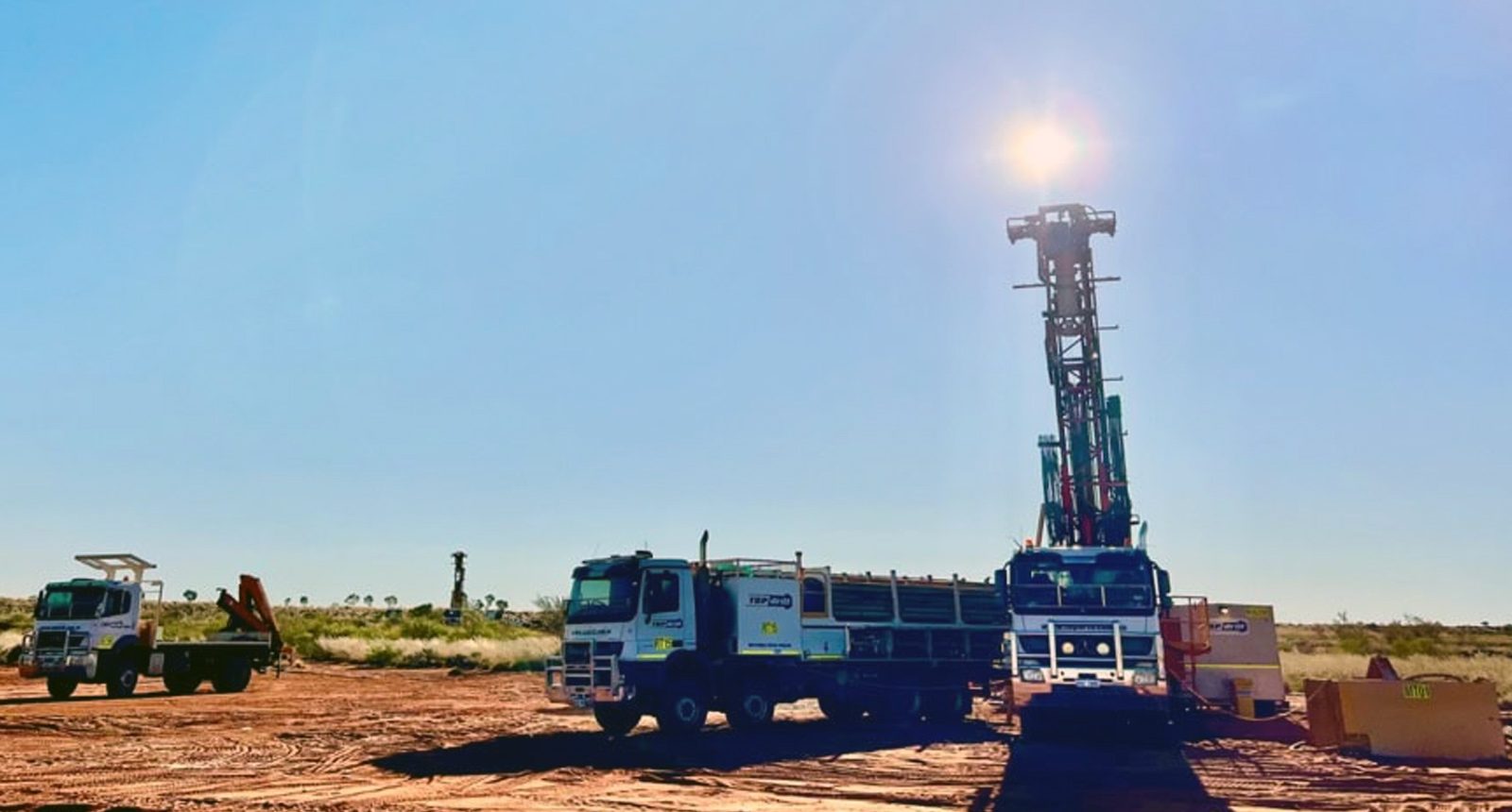 Two drilling trucks at Antipa Minerals' project. The sun sits just above the second working rig.