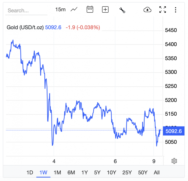 Gold’s down below US$5,100 over the last week. Trading Economics
