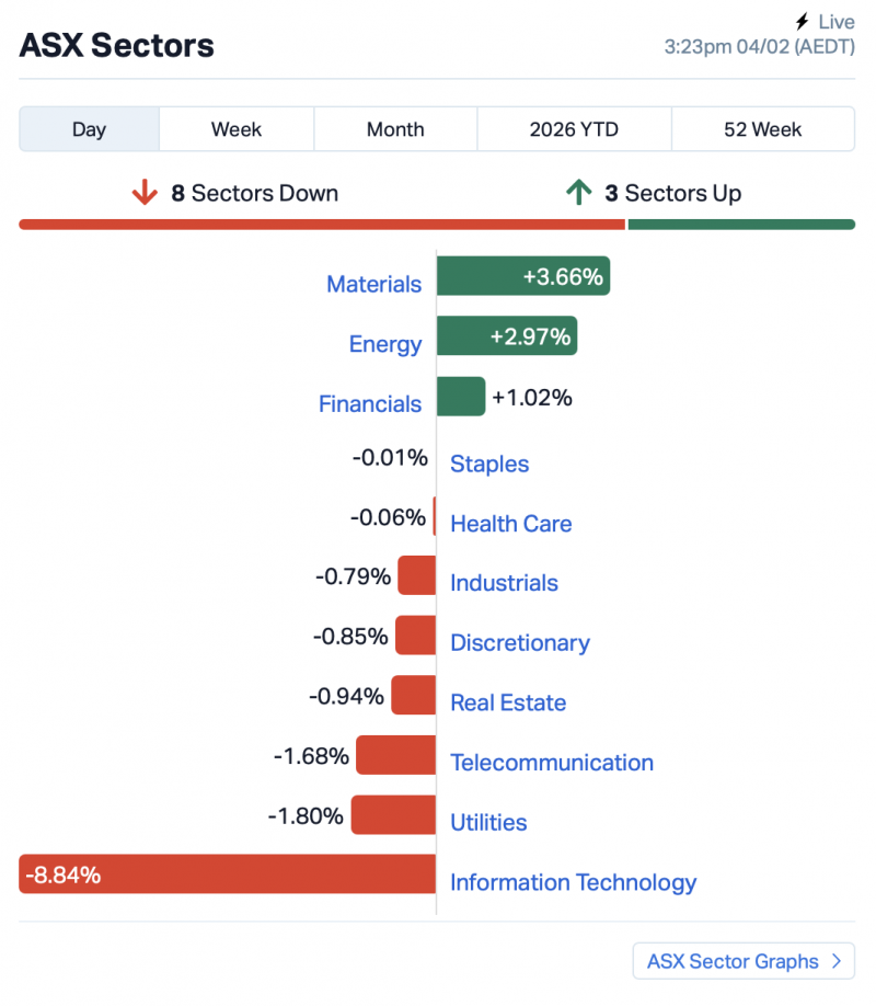 So who’s driving the losses on Wednesday? Take a look at this quick run-through, numbers correct as of 3.30pm AEDT.