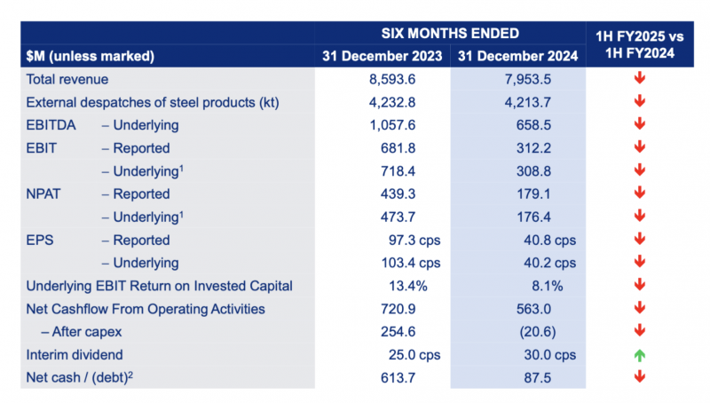 Looking at the usual financial metrics vs PCP, BlueScope’s results only had one “green” arrow out of an entire column of indicators; it’s increased its dividend price.