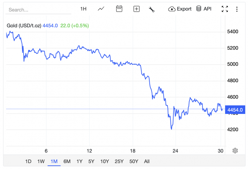 That brings the price of Brent to a position where it’s up +50% over the last month, while gold has staged a decline of -16%. The former safe haven asset sits ~US$4,455/oz. (Silver has fallen just shy of -25% over the last month.)