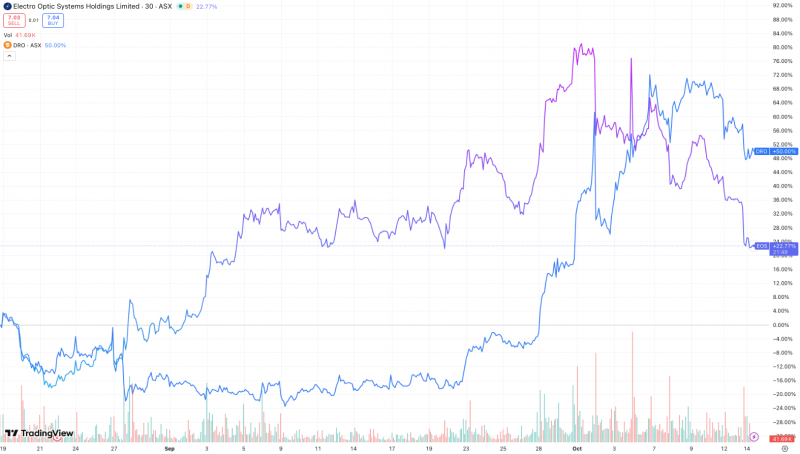 Worth noting, this disparity for EOS pales in size compared to DRO, which is also down on Tuesday on the back of the same wind-back of defence thematic momentum driven by headlines about peace in the Middle East.