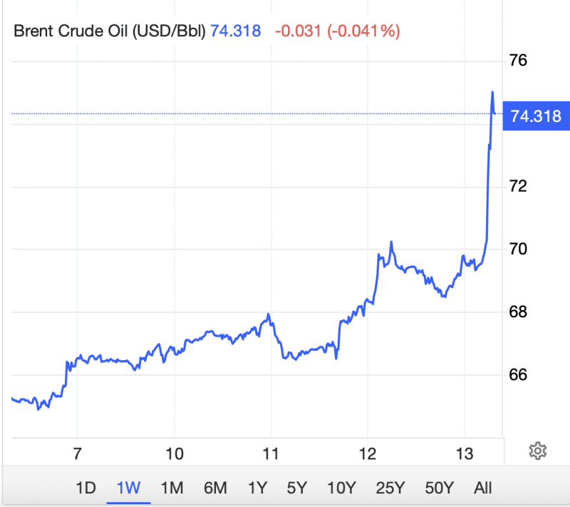 No surprise: Brent Crude jumped +7%, now nearly US$75/bbl. Gold popped +1.15%.