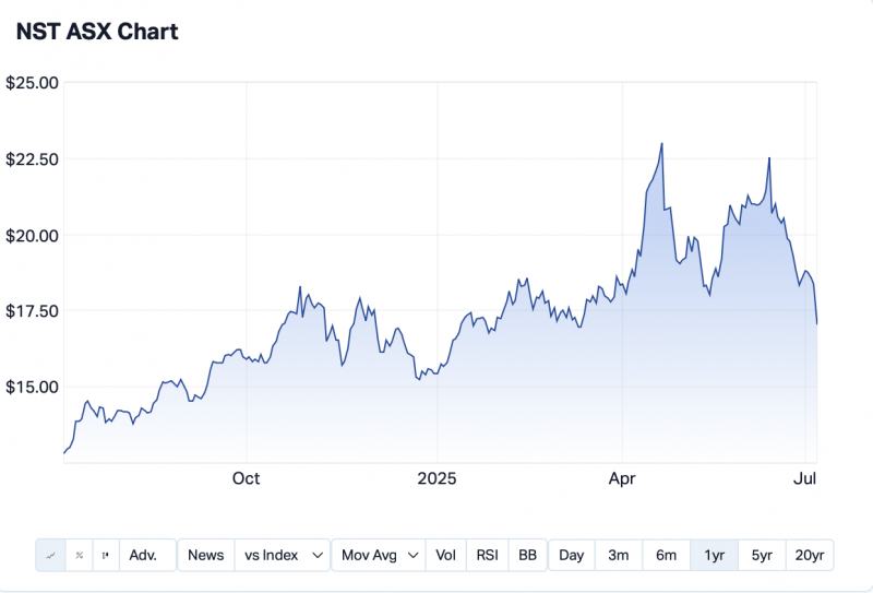 While the company disclosed it was “pleased” to announce these results to market, shareholders weren’t – evidenced in the decline to $17/sh. “For the Kalgoorlie Production Centre, total gold sold was 832koz for the year, below the revised guidance range,” NST wrote. That was enough to do it.