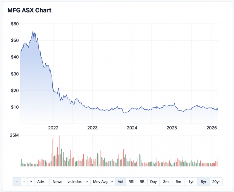 Of course, for Barrenjoey, this deal makes sense given that Magellan looks a little bit like a distressed asset on a 5Y horizon. And for that reason, its shareholders are probably keen as hell to eke as much juice as they can out of the lemon. If that sounds harsh, well, check out the following chart today.