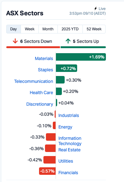 Good Afternoon and welcome to HotCopper’s Market Close for Thursday 9th of October. At least it was a green day! The XJO was tracking for a flattish green finish in the final moments of Thursday intraday trades.
