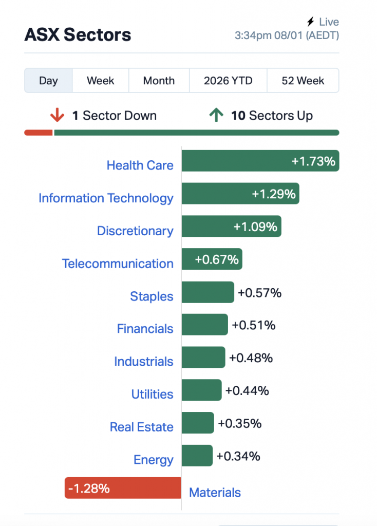 Materials also clocked top faller status on a sector-by-sector breakdown in the final half hour of Thursday trades as an easing gold price sent investors scuttling; Health Care led the gainers, driven up by CSL Ltd, which jumped over +2.5%.