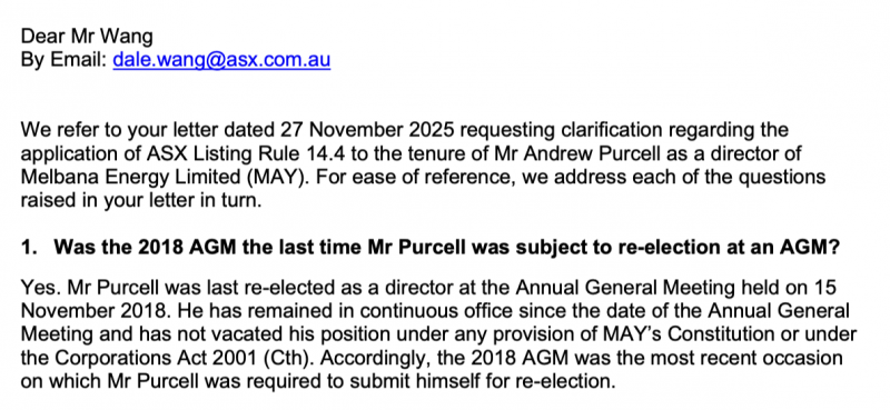 But question four from the ASX reads: “What Corporations Act provisions support the validity of Mr Purcell’s appointment in his continuing tenure?” According to Melbana, after Purcell was re-elected in 2018, in February 2020, Melbana then appointed Purcell to Executive Chairman; he was already Managing Director.