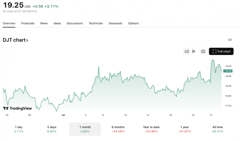 Shares in Trump Media, however, have – it’s jumped over +5% to US$19.25/sh.