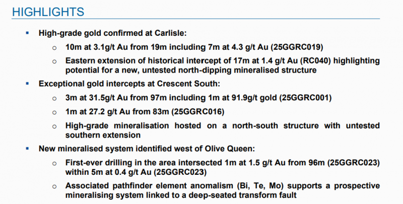 The results confirmed high-grade gold at Carlisle, with one intercept showing 10m at 3.1 g/t Au from 19m including 7m at 4.3 g/t Au. At Crescent South, drilling revealed exceptional gold intercepts, including 3m at 31.5 g/t Au from 97m with 1m at 91.9 g/t gold, and another intercept of 1m at 27.2 g/t Au from 83m.