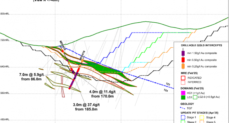 - MDD419: 3.0m @ 37.4 g/t Au from 185.0m (true width 2.9m), including 1.0m @ 90.6 g/t at 185.0m, 15.0m @ 2.2 g/t Au from 195.0m (true width 14.4m), and 7.0m @ 5.9 g/t Au from 86.0m (true width 5.7m)