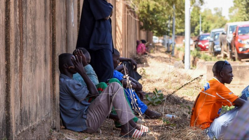 Relatives of victims of the 2019 attack wait outside a morgue in Ouagadougou. Source: Anne Mimault/Reuters.