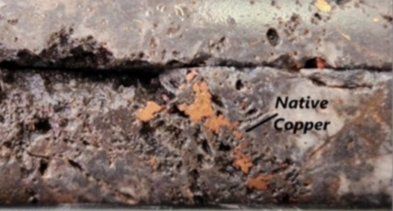 New diamond drilling has intersected a 19.7m downhole zone with native copper, bismuth sulphides and specks of visible gold.