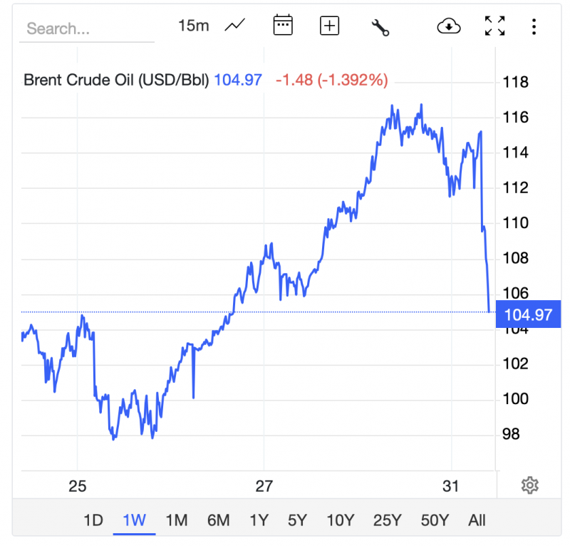 And that has rippled elsewhere. When I woke up this morning, Brent Crude was trading at US$115/bbl. Since that WSJ report came out, it’s had a pretty significant haircut. During the lunch hour on Tuesday, it’s now travelling at US$105/bbl – a loss of US$10 per barrel. Not a dip below the psychological US$100/bbl anchor, but clearly, well received. The WoW chart gives the best visual indicator of context, here.
