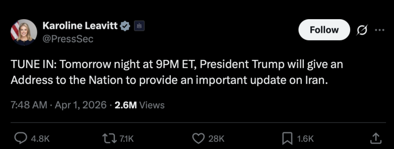 White House Press Sec Karoline Leavitt posted right before lunchtime in Sydney on Wednesday that there will be yet another update on the Iran War “tomorrow night at 9PM ET.” We’ll be watching that one.
