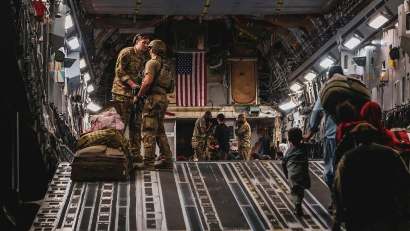 Evacuees board a Boeing C-17 Globemaster III at Hamid Karzai International Airport in Kabul, Afghanistan, on August 23, 2021. Source: US Marine Corps/Sgt. Isaiah Campbell/Handout via Reuters.