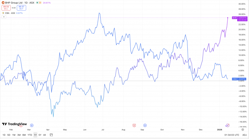 BHP (ASX:BHP) has inched further towards the $50/share mark on the back of a late CY25/early CY26 everything-metals-rally, effectively its all-time high, and enough to more or less make it equal to the other “Mag Two” stock we have Down Under, the Commonwealth Bank (ASX:CBA).