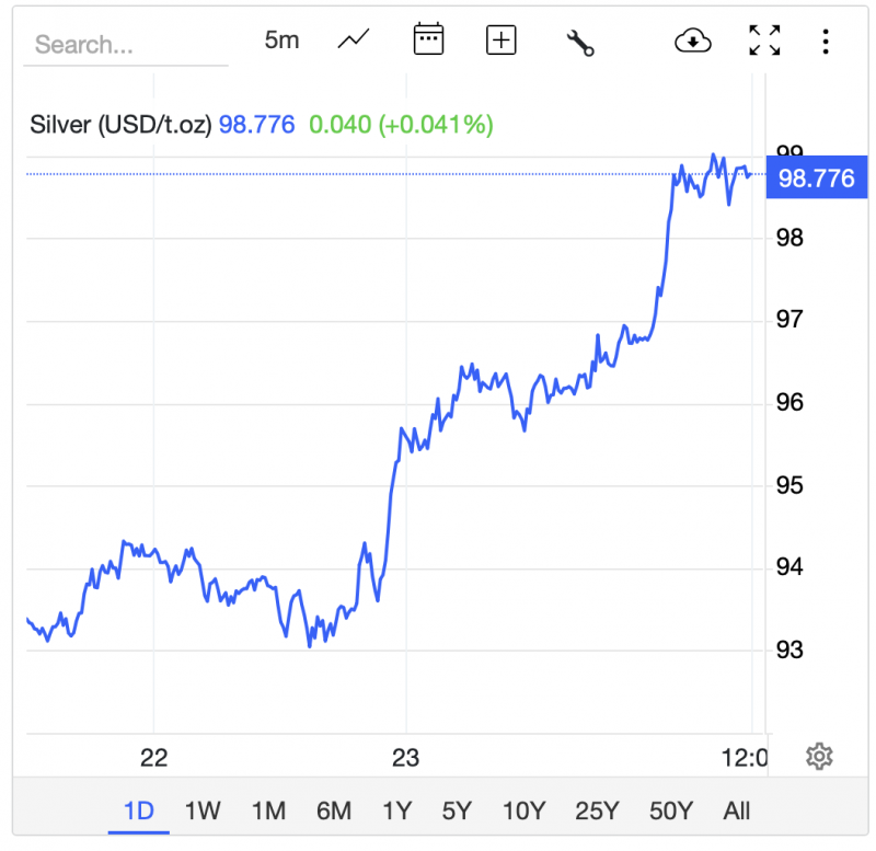 That chart, please note, is just the last twenty-four hours. It is not even too outrageous to use the word ‘insane’ here, especially seeing as it looks like we just evaded a trade war. The world wants gold, and nobody is worrying about the top being in. For reference, here’s the last twenty-four hours for silver: