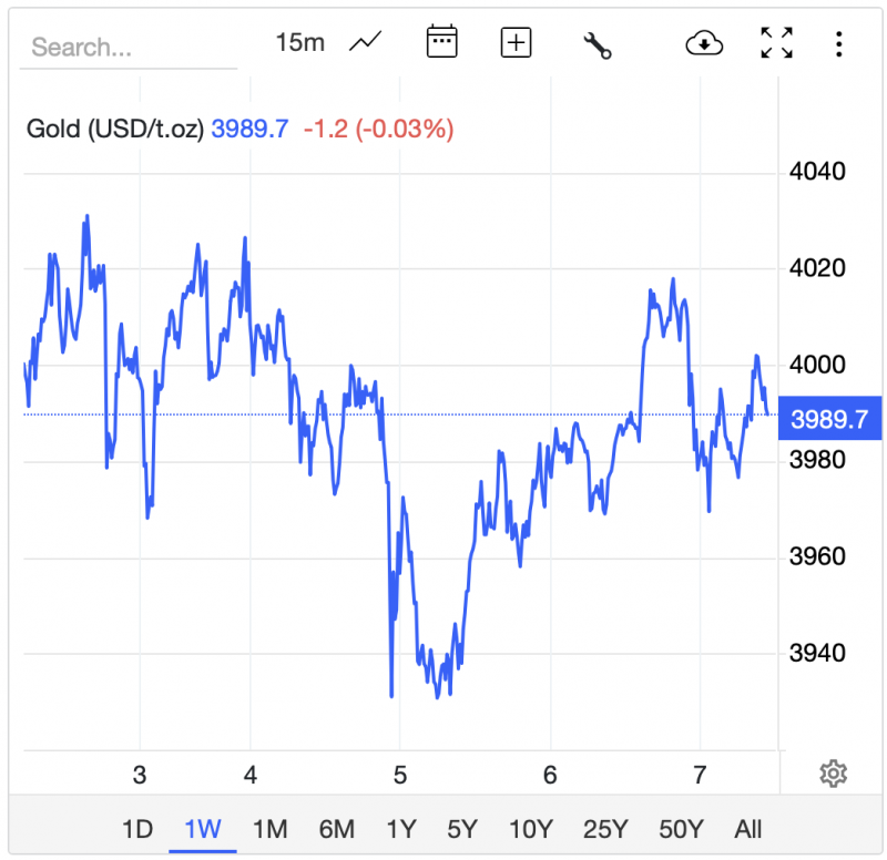 - Gold has receded below $4K/oz, gone back over; dipped back down, and as of Friday afternoon, is back at $4k/oz.