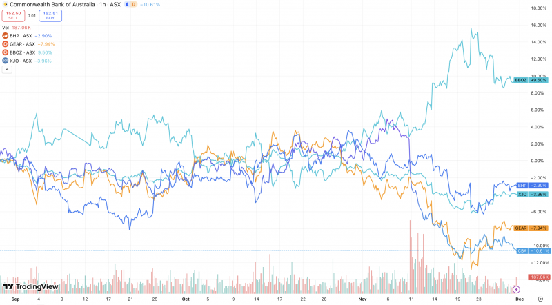 Here I have compiled the charts for Commonwealth, BHP, the ASX200 (XJO), and the two leading leveraged Betashares ETFs that track overall Australian sentiment – the BBOZ Bear ETF and the GEAR Geared Australian Equities ETF.
