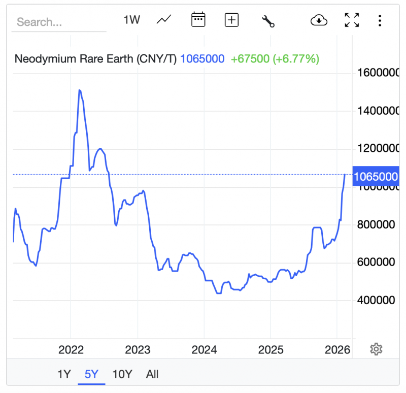 Looking at this 5Y chart, we can see that the price of Nd has returned to its late-COVID highs. Clearly, it hasn’t taken a cue from the price of gold that the metals rally is taking a breather.