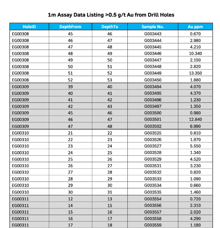 Then, to make matters more confusing, the company then posted its “raw data” on page 16 of the announcement, which effectively demonstrates low-grade hits, judging (albeit subjectively) by the parts-per-million (ppm) column.