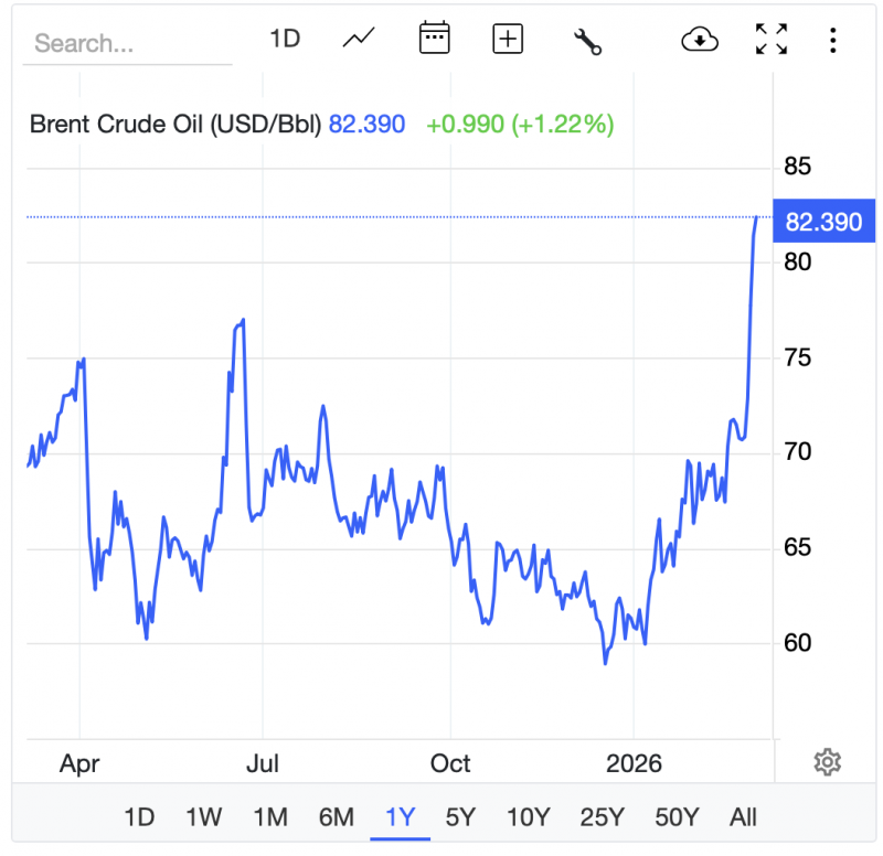 Well, Trump has since said the operation could be four weeks long, and since then, Iran has declared it will indeed start attacking ships that use the Strait of Hormuz (presumably those of Middle Eastern nations hosting U.S. bases, which Iran has been attacking). Cue a Brent Crude price chart that looks like this.
