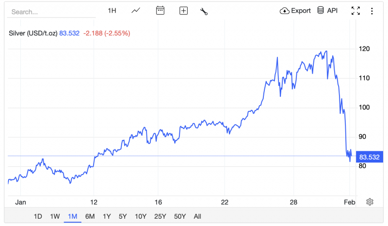 Silver markets, in particular, have been running dangerously hot. I’m going to assume the ‘haven metals’ investment thesis hasn’t permanently bifurcated into a story of gold and silver yet, so I’ll treat silver as a speculative asset in trying to explain the sell-off. And there, I think, it’s just profit-taking and nerves.