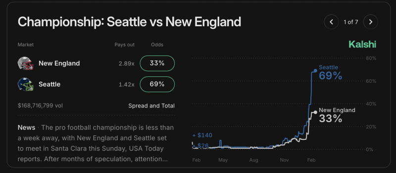 That’s a screenshot of the most popular bet on Kalshi at the time of writing, which happens to be a sports bet around the American Super Bowl (something that will be familiar to Australian readers).