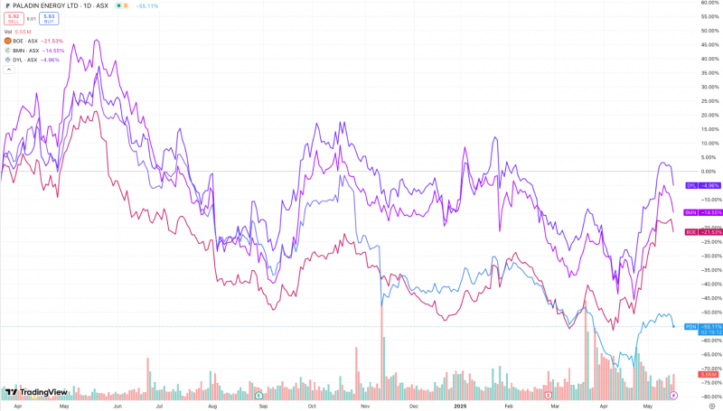 1Y price action for DYL, BOE, BMN and PDN expressed as a line chart. (Tradingview)